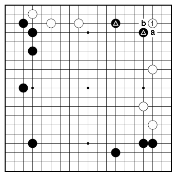 Problem. Black to play In this four-stone handicap game, White has invaded at 1. On which side should Black block, at 'a' or at 'b'? |