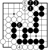 Dia. 2. Capturing a stone Many players might be quite satisfied with capturing a stone with 1 and 3 while securing three points of territory. However, White ends in sente and immediately rescues his three stones at the bottom with 4. Next, Black plays 5 for an additional two points. White 6 takes the last point and Black defends with 7. The result: Black: 20 points. White: 20 points. A draw. |