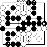 Dia. 1. The correct endgame sequence The hane of Black 1 is the correct move. White has no choice but to answer with 2. Black's territory in the upper right corner is now secure, so Black switches to the bottom left corner and connects at 3. White ataries with 4, but Black ignores it and blocks with 5, forcing White to defend at 6. Black connects at 7, ending the game. The result is a draw. Black: 15 points. White: 15 points. |