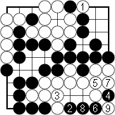 Dia. 3. A seki Suppose White answers Black 5 in Dia. 1 by capturing at 1. Black will atari with 2, then attach at 4, threatening to throw in a stone at 5. White is forced to connect at 5. Black now plays a hane with 6. The result is a seki. If White tries to start a ko with 7, Black will connect at 8. After 9, White will have to fill a liberty to start a ko, but Black will take the ko first and White has no ko threats. |