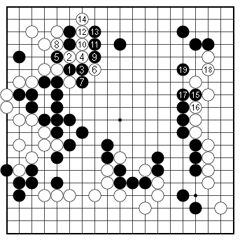 Dia. 4. How Black should have played. Instead of 87 in Figure 2, Black should have cut with 1. The moves to 14 could be expected. Black could then fix up his shape on the right side with 15 to 19, ending up with a vast valley of territory in the center of the board and a won game. |