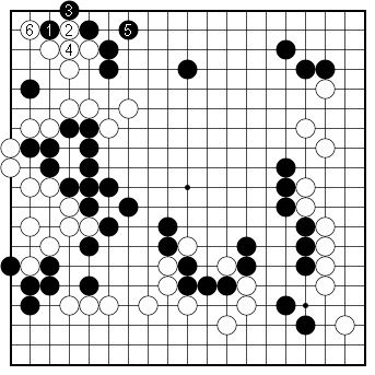 Dia. 2. A better way to defend Instead of 89, a better way to defend the top would be for Black to attach at 1. After White connects at 4, Black connects at 5, which makes a deep white invasion unlikely. White might be compelled to atari at 6, as a black move there would be quite big, in which case Black would end in sente. |