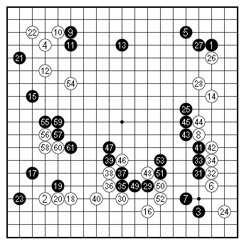 Figure 1 (1–61). The side attachment The position in the problem diagram arose in a game between Nyu Eiko 4-dan (white) and Numata Sakiya 6-dan in the first round of the 71st NHK Cup, broadcast on TV on May 28, 2023. Nyu is a disciple of Michael Redmond 9-dan and is the holder of the Senko Cup, the most prestigious Japanese women's title (first prize is 8,000,000 yen). White invaded Black's moyo on the right side with the attachment of 56. After Black 61, White's three stones are isolated inside Black's sphere of influence and they have to find a way to make eyes or to link up with some of their allies elsewhere on the board. |