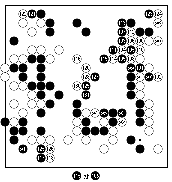 Figure 4 (90–131). The endgame begins. With White 90, the endgame begins. Both sides are expanding their territories and reducing the opponent's. Compare the difference between Black's territory in the center in Dia. 4 and his center territory in this figure. This shows how big a move White 88 in Figure 3 was. After exchanging White 130 for Black 131 — |
