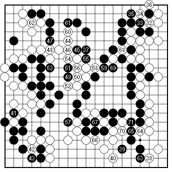Figure 2 (62–87). White links up. With the moves to 86, White has managed to link up his stones and deny Black the territory on the left side. In the process, however, Black has been able to thicken his position on the left side facing the center. Instead of capitalizing on this thickness by cutting at 'a', Black makes an endgame move with the hane of 87, perhaps hoping to further reduce White's territory on the left side. It seems that Black has become so fixated on attacking White's position on the left side that he is no longer aware of the global situation. |