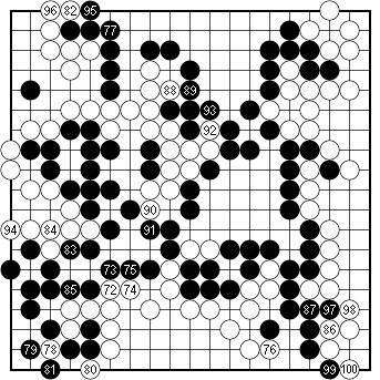 Figure 3 (88–89). Defending the top White defends against the cut with 88. She is obviously aware of the strategic importance of this cut. White 88 also threatens to invade the top, so Black defends with 89. |