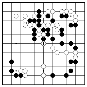Dia. 3. The one-space jump 2 If White jumps to 1 here, Black 2 captures three stones, again rescuing his stones at the top. |