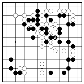 Dia. 6. Black escapes. Instead of 6 in Dia. 5, White might choose to capture three stones by cutting at 6. Black would then capture two stones with 7 and his stones at the top have escaped. Finally, White secures his thin group on the right side with 8 and 10. |