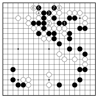Dia. 8. Behind by one move Black 1 is another way that Black might try to link up. After Black cuts with 3, White blocks at 4 and a capturing race begins. Black tries to make eyes with 5 and 7, but he is still one move behind in the capturing race. |