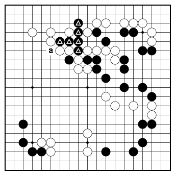 Problem. Black to play Black's marked stones seem to be trapped, but there is a defect in White's position at 'a'. What is the tesuji that will enable Black to exploit this defect and escape with his group? |