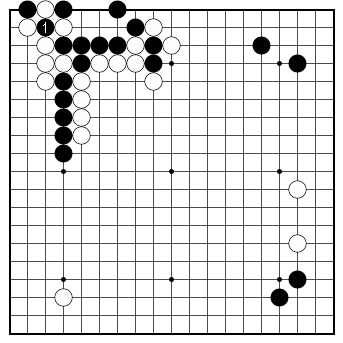 | The position in the problem below arose from one of the difficult variations of the taisha joseki. Nowadays the taisha is almost never played, at least not the difficult variations, but it was quite popular in the 18th century up through the 1970s. To understand why it is no longer or rarely seen in professional go, see Shibano Toramaru's book Joseki Revolution. In any case, many interesting ko variations arise in the hundreds of variations of this joseki. The one below is particularly interesting. |