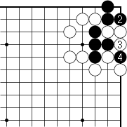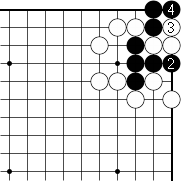 Dia. 4. Capturing a stone Instead of the atari of 2 in Dia 2, the atari from below with Black 2 also fails. Again White sacrifices three stones with 3. After Black captures with 4 — |