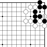 Dia. 3. Capturing a stone Black recaptures a stone with 5 and, surprisingly, Black ends up with a false eye at 'a'. With only one eye in the corner, Black's group is dead. |
