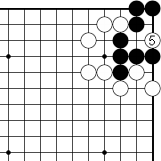 Dia. 5. A dead three-space eye Black ends up with a dead three-space eye. White makes a placement on the key point of 5 and Black's group is dead. |