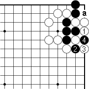 Dia. 6. A ko Immediately turning at 1 is a mistake. Black will atari at 'a' and live. However, if Black mistakenly ataries with 2, White will atari at 3. When Black captures with 4, the result is a ko. |