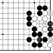 Dia. 4. White gets two eyes If Black tries to kill the white group by connecting at 8 and making a placement at 10, White will answer by descending to 9 and connecting at 11, making an eye. If Black now connects at 12, White 13 ataries three stones. When White captures them, he will have made his second eye. |
