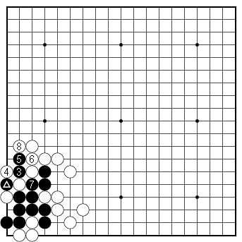 Dia. 6. A ko Black can atari at 3 and play the moves to 7. After White turns with 8, Black can capture at the marked stone and start a ko. The bottom line is that Black can avoid this complication by simply playing the atekomi of 1 in Dia. 1. |