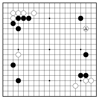 Problem. Black to play Considering the principle mentioned in the introduction above, doesn't it seem strange for White to have approached inside Black's sphere of influence with the marked stone? White has instantly created a weak stone for Black to attack. How can Black use his material advantage to punish White for this dubious invasion? |