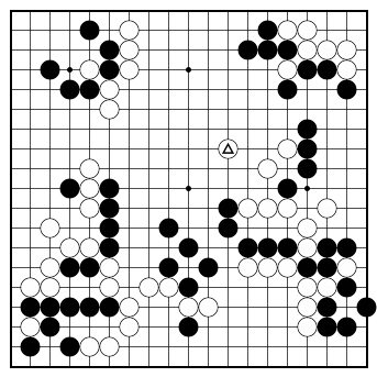 | Positions, or groups of stones, are often referred to as being either thick or thin. Thick positions usually have eye shape and are invulnerable to attacks. On the other hand, thin positions are those that do not have eye shape or may not be able to easily get that second eye crucial for life. In the middle game a player should always be on the lookout for thin groups and figure out ways to attack them. Of course, strengthening your own thin groups is a high priority. |