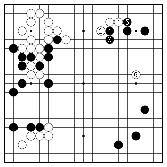 Dia. 6. Double atari Black hanes at 6 and White cuts at 7. A series of ataris now follows, culminating in a double atari on three stones at the top and three below. Whichever group of three stones White decides to give up, it will not be good for him. This is just one example of how White's bad aji at the top can help Black counter any invasion into his moyo below. |
