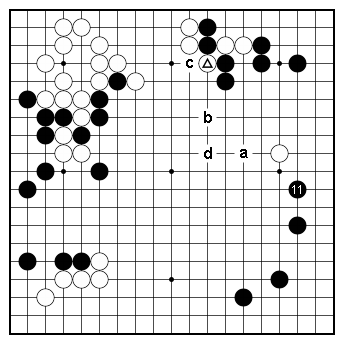 Dia. 4. Exploiting the aji Without playing the forcing moves in Dia. 3, Black attacked the white stone with 11 and left the position at the top undefined. If White now runs away with 'a', Black can play a knight's move at 'b', threatening to capture the marked stone in a ladder, starting at 'c'. If White defends against this threat with a move around 'c', Black can continue his attack at 'd'. |