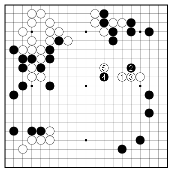 Dia. 5. Attacking with a cap After White jumps to 1, Black might first peep at 2, then directly attack with a cap at 4. Let's assume White fights back with an attachment at 5. Next — |
