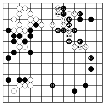 Figure 2 (47–69) When Black played 57 (Black 11 in Dia. 4), White immediately eliminated his bad aji at the top with 58. After White extended to 68, Black played a nose-attachment tesuji at 69, attacking two white stones. |