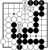 Dia. 1. Atari from underneath The atari from underneath with Black 1 is the key move. With the sequence to 6, Black ends in sente, so he can capture three stones at the bottom. White takes the last two points with 8 and 10. The result: Black: 21 points. White: 20 points. Black wins by one point. |