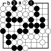Dia. 2. Short of liberties White cannot answer Black 1 with the atari of 2. Black will descend to 3. White is now short of liberties: he can't atari at 'a' or at 'b', so all of his stones at the top are dead. |