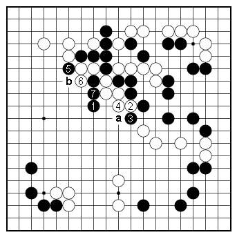 Dia. 5. Two options After Black 1, instead of 2 in Dia. 1, counterattacking with the hane of White 2 fails. Black ataries at 3, and then at 5. If White ataries at 6, Black connects at 7. He is now threatening to capture five stones at 'a' or three stones in a ladder at 'b'. |