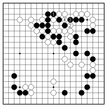 Dia. 2. The one-space jump 1 If White jumps to 1, White captures with 2 and 4, rescuing his six stones at the top. |