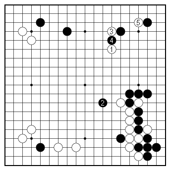 Highlight Diagram Before Black can consolidate his territory on the right side and the top, White plays an erasing move with 1, preparing to whittle down the size of Black's moyo. Black is also concerned about White's moyo at the bottom, so he plays an erasing move of his own at 2. Next, White attaches with 3 and Black wedges in with 4. These are standard moves. Suddenly White attaches at 5. This is a startling move. It is full of kiai and leaves behind all kinds of troubling aji that Black, and White as well, will have to consider. |