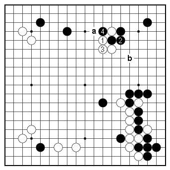 Dia. 1. A conventional move Instead of 5 in the Highlight Diagram, the atari of White 1 is a conventional move. After Black 4, the points 'a' and 'b' are miai; if White plays one of them, Black will play the other. Either way, Black will secure a large swathe of territory. |