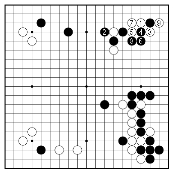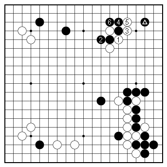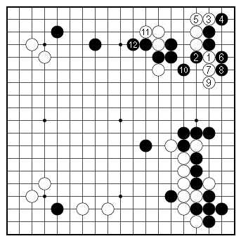 Dia. 4. White has settled his stones White ataries with 3, then at 5, and again at 7. He finally connects at 9, threatening to capture two stones. Black answers with 10 and White threatens Black's three stones in the corner with 11. Aside from whether or not Black's three stones can live (they can, but in gote — see Next, White can aim to invade the top at 'a', exploiting the aji of the marked stone. |
