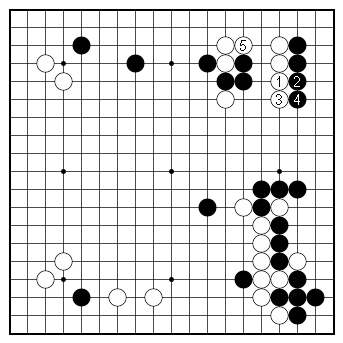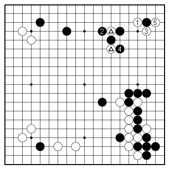 Dia. 5. Decoys Black could answer White 1 with 2. If White 3, Black 4 neutralizes the two marked stones. In the meantime, White plays 5. establishing himself in the corner. Black can no longer expect to turn his moyo on the right side into territory. If Black follows this path, the two marked stones will have acted as decoys. |