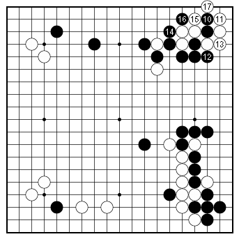 Dia. 7. The squeeze Black descends to 10, then squeezes with the moves to 16. After White captures with 17, he is confined to the corner and Black has consolidated his moyo on the right side and ended in sente. |