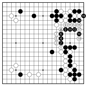 Dia. 9. White builds a thick wall. White 15 in Dia. 8 was well placed. Later, if White gets a chance, he will want to build a wall with 1 to 7. Black 6 runs right into the marked stone and White continues to force with 9 to 15. After Black captures two stones with 16, White exchanges 17 for 18, and the clamp of 19 leaves Black with little territory and a lot of bad aji. In contrast, White's wall is overwhelming. |