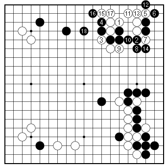 Dia. 13. How White actually played. Instead of extending to 1 in Dia. 12, White suddenly fell back and turned at 1, making eyes for his group at the top. Black immediately played a hane at 2 aiming to confine White's group to the top. This he does with the moves to 18. Up until White 1, the AI monitoring this game had both sides even, but suddenly AI favored Black. |
