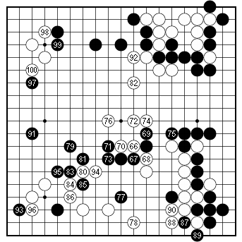 Figure 2 (66–100) With the moves to 92, White has established a strong position in the center while Black has neutralized White's wall on the bottom. AI still favors Black. |