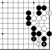 Dia. 9. Variation What happens if Black answers White 1 with an atari from the left with 2? White will again increase the sacrifice to two stones by descending to 3. Black blocks with 4 and White again plays the key descent of 5. Next — |