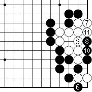 Dia. 10. Continuation As in Dia. 7, Black tries to prevent White from making two eyes with 6 and 8, but, after 10, he finds his stones short of liberties when White ataries with 11. |