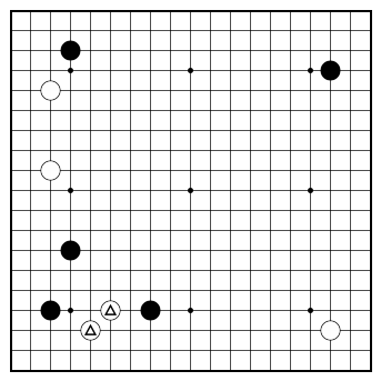 Problem. Black to play The two marked stones are outnumbered three to two and White needs to somehow settle these stones. Unfortunately, it is Black's move. How should Black attack these two stones before White has a chance to settle them? |