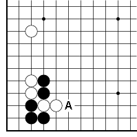 Problem. Black to play Black is split into two groups, neither with eye shape. If Black is going to rescue both groups, he is going to have to capture some white stones. It will take three different consecutive tesujis to accomplish this. The nose attachment of Black A looks like a good candidate tesuji, but Black's position is currently too thin to support it. Black needs to play some preparatory moves. How should he play? |